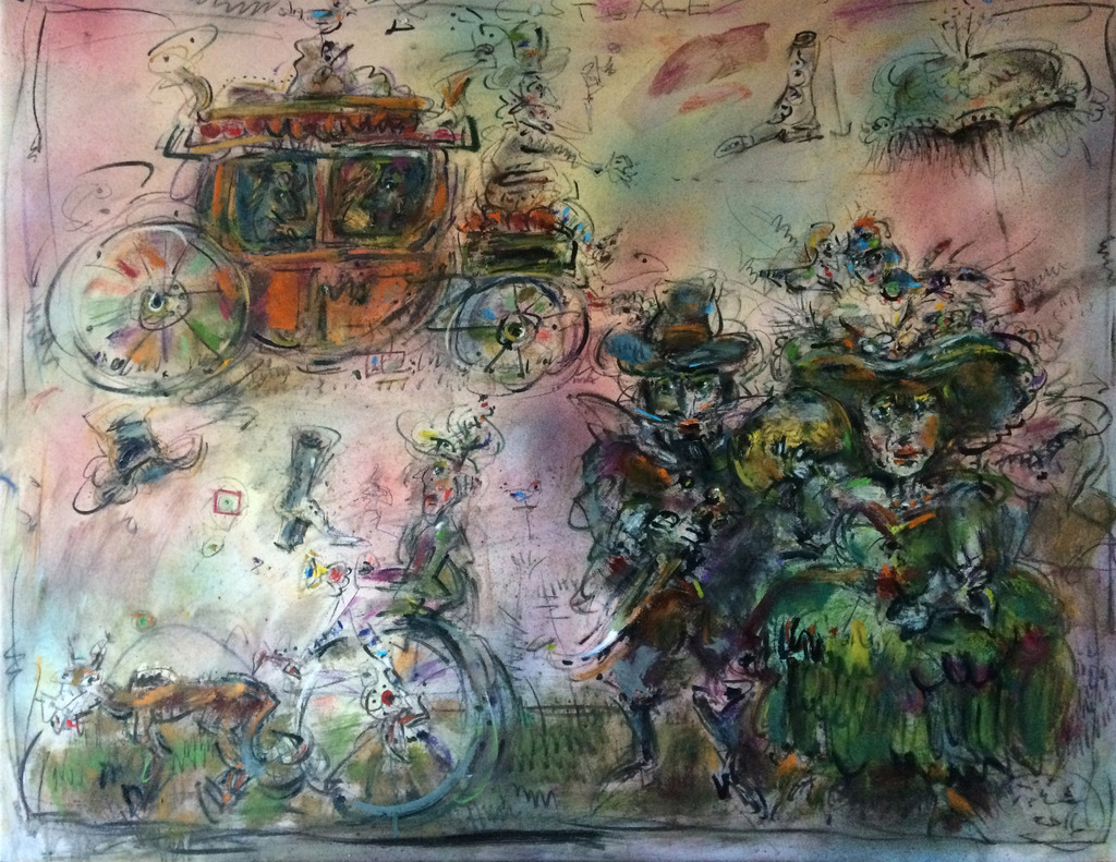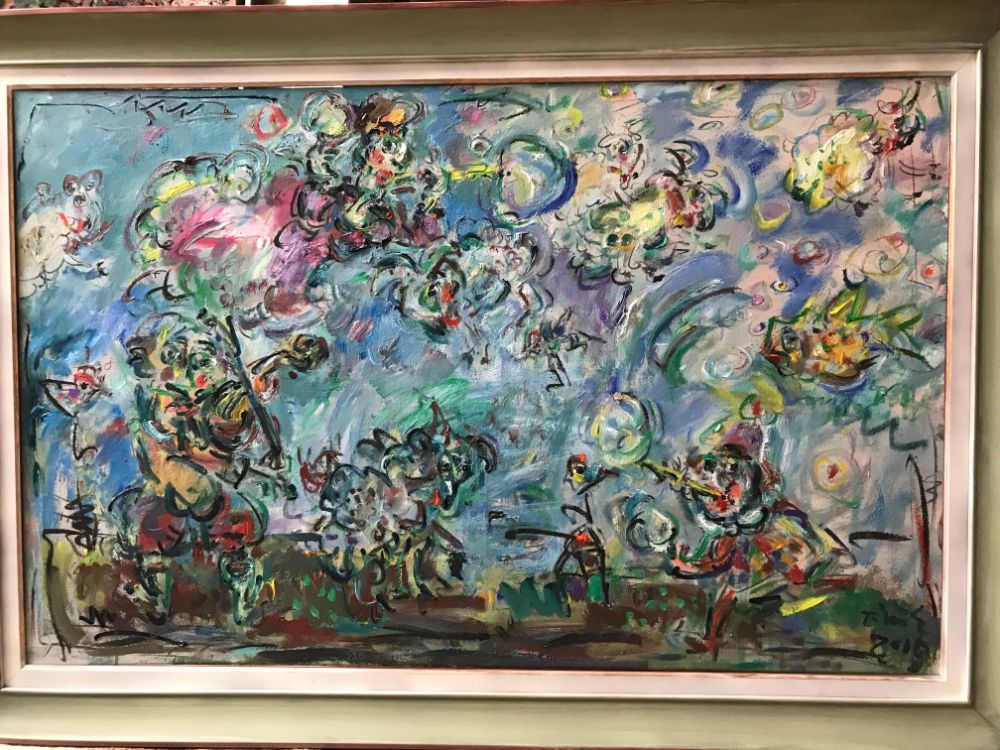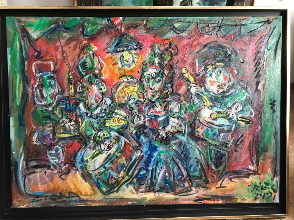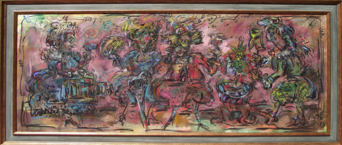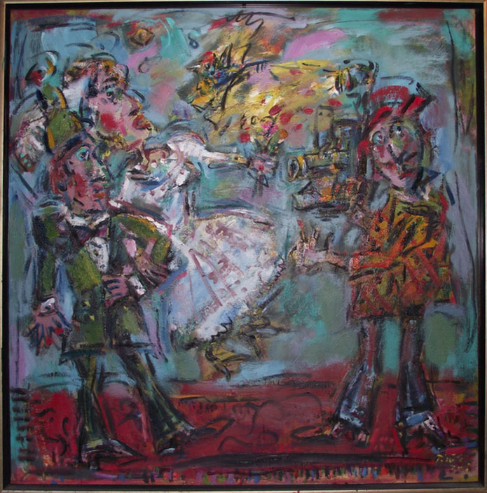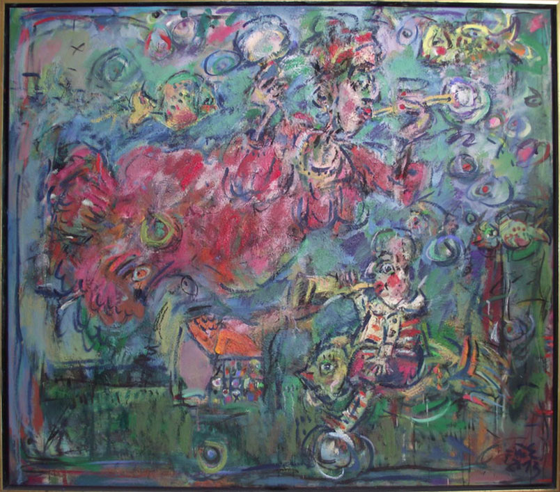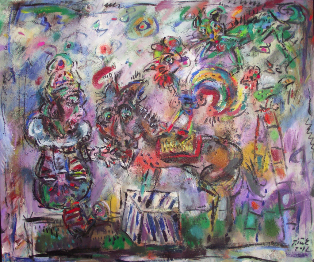 Ernő Tóth made a rather interesting detour in the jungle of arts. At the Secondary School of Arts he majored in sculpture, then, at the Academy of Fine Arts he studied painting from Iván Szilárd, who followed the traditions of the famous Hungarian painter István Szőnyi. After graduation he worked as a scenery-sculptor at the Hungarian Opera House for several years, where he painted lyrical scenes based on large, pictorial patches. Whereas during the last 5-10 years he ended up at drawing in his paintings, and also calls his sculptures three-dimensional drawings. Yet, one of his paintings displayed here,k the first picture of the exhibition entitled Clown with a Chameleon from 1991 clearly shows that he has a very good sense of colour, gestures, large scales, and of even more heroic expression His clown is drawn in a childish style, yet he suggests power, as he is a monumental figure burning in a visionary, mythical fire. As his hand reaches for the chameleon with its ever-changing colours, he recalls William Blake's associations and the strong, almost violent pictorial features of the COBRA group, especially Karel Appel. In spite of all this, in the past 15 years Ernő Tóth has chosen the graphic style. Moreover, he decided to use genres such as caricature, narrative and grotesque, which were so much despised in modern times, then re-valued in the post-modern. The thousands of tiny creatures and details in his perpetuum mobile must have been inspired by his own vibrating, excitable personality a kind of feeling of the horror vacui. In addition, the motivation might also have been our petty, selfish and violently pushy age that is falling into its atoms. As a result, Ernő Tóth covered his canvases and papers with the continuous bustle of his figures, who commit all the human sins intemperance, lie, arrogance, silliness, boasting, hypocrisy, kowtow with all-out effort, yet they are expressed with love and humour. His view is basically determined by the theatre and the circus, as all his works of art are kinds of scenes from the commedia dell' arte, they are parables and fables. In his pictures one can find the characters of a big fairy tale book or a secret garden: mainly clowns, bogeymen, Don Quijote, Munchausens, beautiful ladies and personified animals walk up and down and play parts from scene to scene, thus representing the silliness of mankind. The main character of his paintings is the clown dressed in a striped costume, whse stumbling figure may suggest some kind of a self-portrait. This self irony indicates that unlike James Ensor, forerunner of grotesque views and usage of masks, yet despising mankind, Ernő Tóth does not treat his characters in a nasty way. Instead of judgement he applies a kind of understanding love to depict the acts that are often senseless or reprehensible. He can clearly see that one is not able to learn from others' mistakes, not even from their own ones and it is pretty obvious that "we are all a bit burnt food" as the Hungarian writer Béla Hamvas put it. Ernő Tóth turns the most absurd deed into a jolly carnival or ball scene, or even a harvest feast. One of his frequently returning topic is the tale that ridicules human ambitiousness, The Musicians of Bremen, which in accordance with the title of the exhibitions the audience can see both in the forms of painting and sculpture. The pyramid of the animals is difficult to build. On one side a clown is enticing the donkey with some straw, while on the other side another one is pushing the bottom of the stubborn mule, and the lean-flanked cat jumps into its place at the last moment. The creation of the formation is not the result of the clumsy human's will instead it is due to the magic power of the goat playing the violin. That often returning motive seems to be the caricature of Marc Chagall's violinists, who influenced Ernő Tóth's pictorial world. In the foreground in the role of the ringmaster one can recognise Danny de Vito, who arrived at the scene from Tim Burton's film, Big Fish. The jolly, visionary bubbles surrounding the swinging, juggling clowns with heart-shaped legs are also from that film. Many of Ernő Tóth's works were inspired by films and music. The most important one is Fellini's Clowns, which affected the major figure in Ernő Tóth's iconography: the clown. It is rather interesting that Ernő Tóth's bard does not follow the types usual in the commedia dell' arte or at the circus. They combine the features the white-faced, fooled Pierrot and the colourfully dressed Harlequin, who supports the black-faced Scarpino playing the role of the devil. He is a deceiving, yet still more of a deceived lover at the same time. Such cheated figures are shown in the painting that caricatures the ravenous consumer society. The title is: Who can take more? The picture depicts the doubled figures of two clowns, who are about to burst as they are having a dumpling eating competition. "I am at my wit's end as I eat and eat and" sang Laca fe Lugossy in the alternative group called Bizottság, yet the famous guzzling scenes from the Hungarian film The Watch-Box is Leaving, are also depicted in the background of this multicoloured picture. The novelty here lies in the very up to date contents. It is not the greed of the manipulated customers that gives us an aversion it is rather the whispering-grinning kibitzers behind them, who manipulate and persuade them. It is the shiftiness and vileness of the media and PR serving the capital that would disgust us.