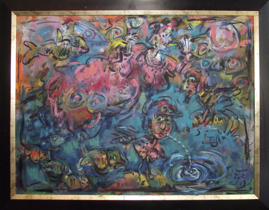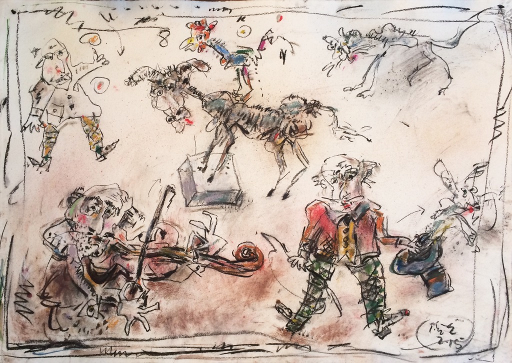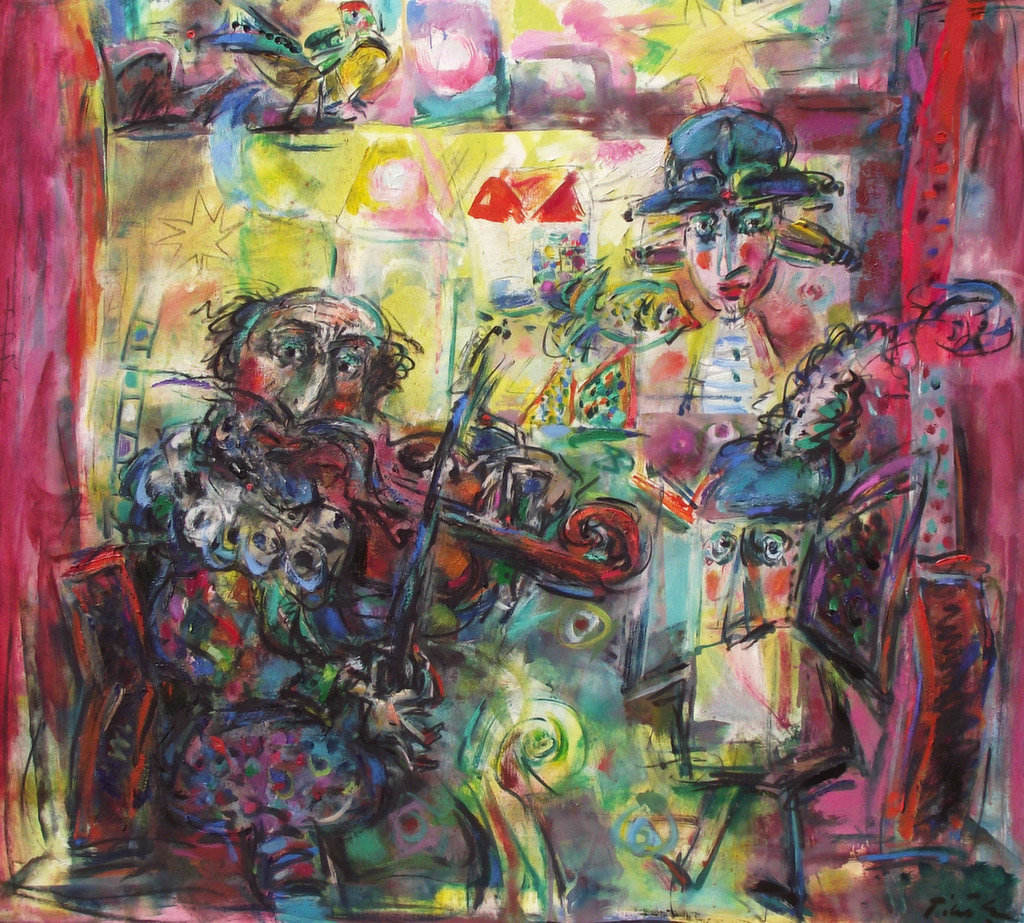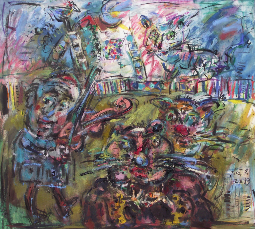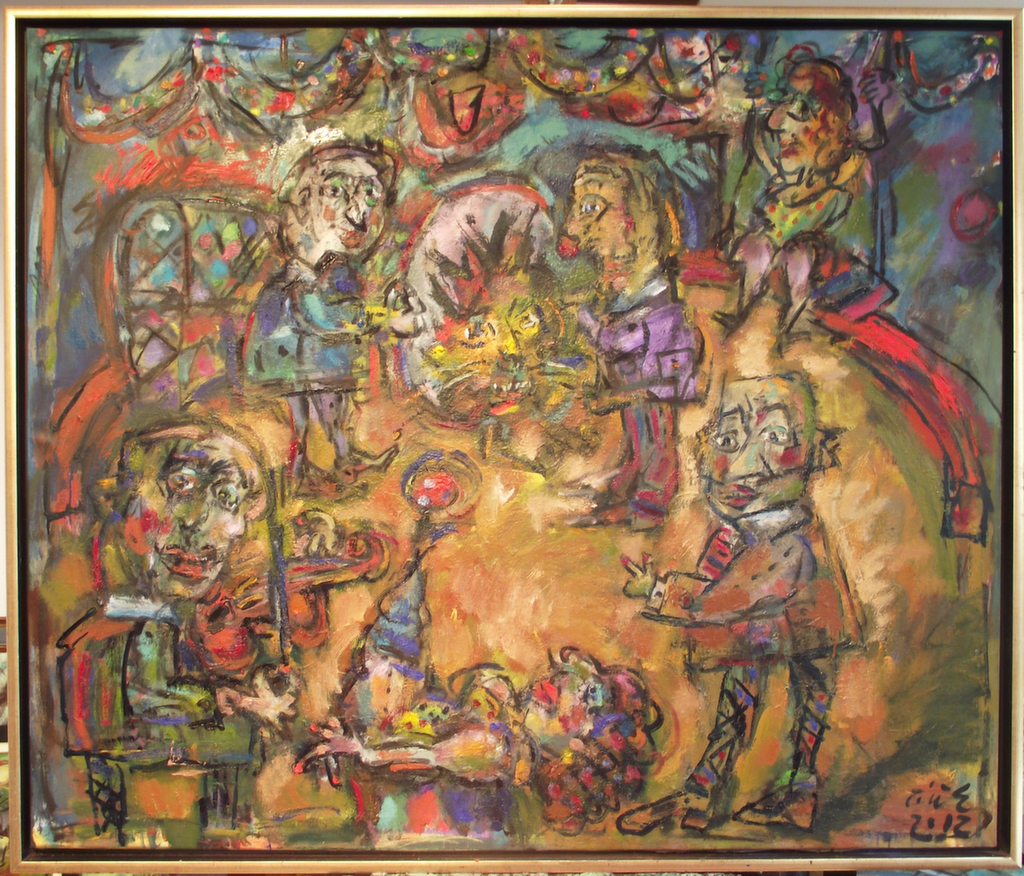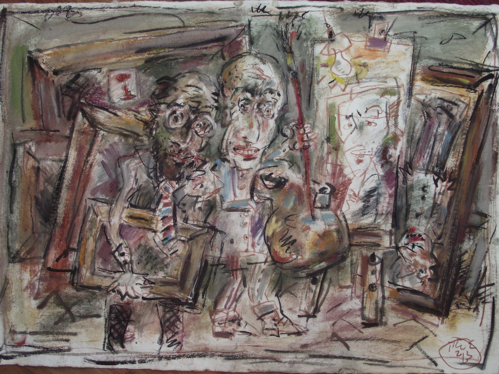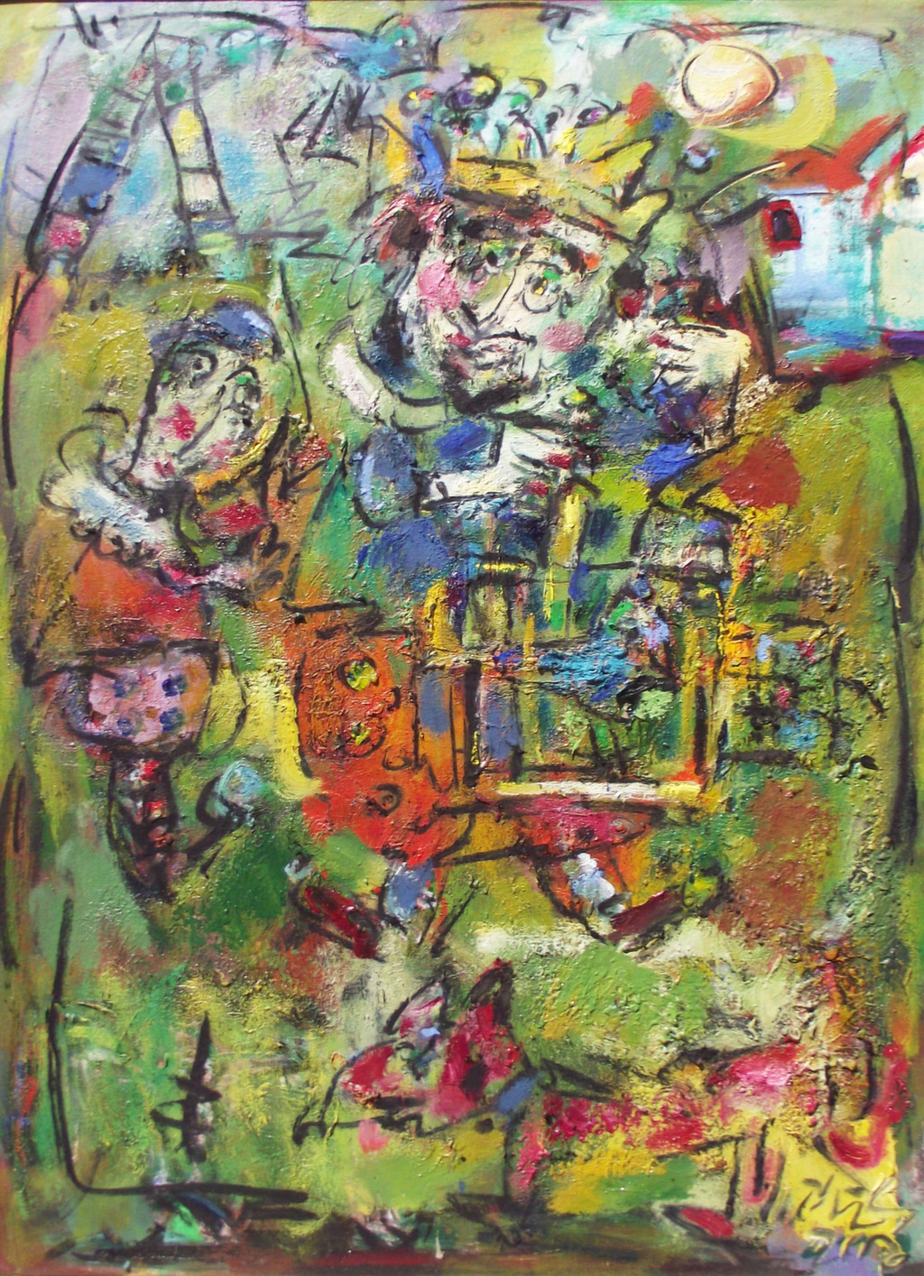 In his painting entitled Would You Like a Glass of Water? Ernő Tóth draws the attention to the dangers of the consumer idiotism exploiting the environment in a rather playful, humorous way. In this picture a clown is taking water for a goldfish put in fish tank. Art is certainly never just the message of the topic, but it is also a game with the artistic means and devices. Although Ernő Tóth emphasises drawing in his works, I would also like to draw the attention to the picturesque reflection on the surface of the water in the fish tank, which recalls the art of Béla Czóbel, Jean Dubuffet and Karel Appel. This clearly shows how Ernő Tóth can keep the joy of playing with colours, even if he has restricted himself into a narrow area within the graphic art. Getting back to that pair of clowns, he also gives an answer to the question why these sweet scamps can be deceived so easily. In his painting depicting clowns playing chess he expresses their stupidity: one of them is narrow-minded and short-sighted, which characters are represented by how closely he is watching the chess piece. The other is a Don Quijote look-like figure, who is thinking with a gesture that recalls Winnie-the-Pooh. Such guys can be cheated very easily! Besides representing both the current and the constant human features, clowns are also very good figures for Ernő Tóth to play with the topic of the great figures in art history, but in a more lyrical, more melancholic and in a somewhat dramatic way. A good example is the Prodigal Son, whose father recalls Rembrandt's figure combined with Picasso's clown king, painted in the painter genius' old days. Of course, the prodigal son is a clown, and since the father is a painter, the home-coming son provides a hidden self-portrait here. Under the pale sun a ladder appears symbolising transcendence and the desire for spiritual purification. The figure spying in the background is again a form of the manipulator and trouble maker customary in Ernő Tóth's paintings.