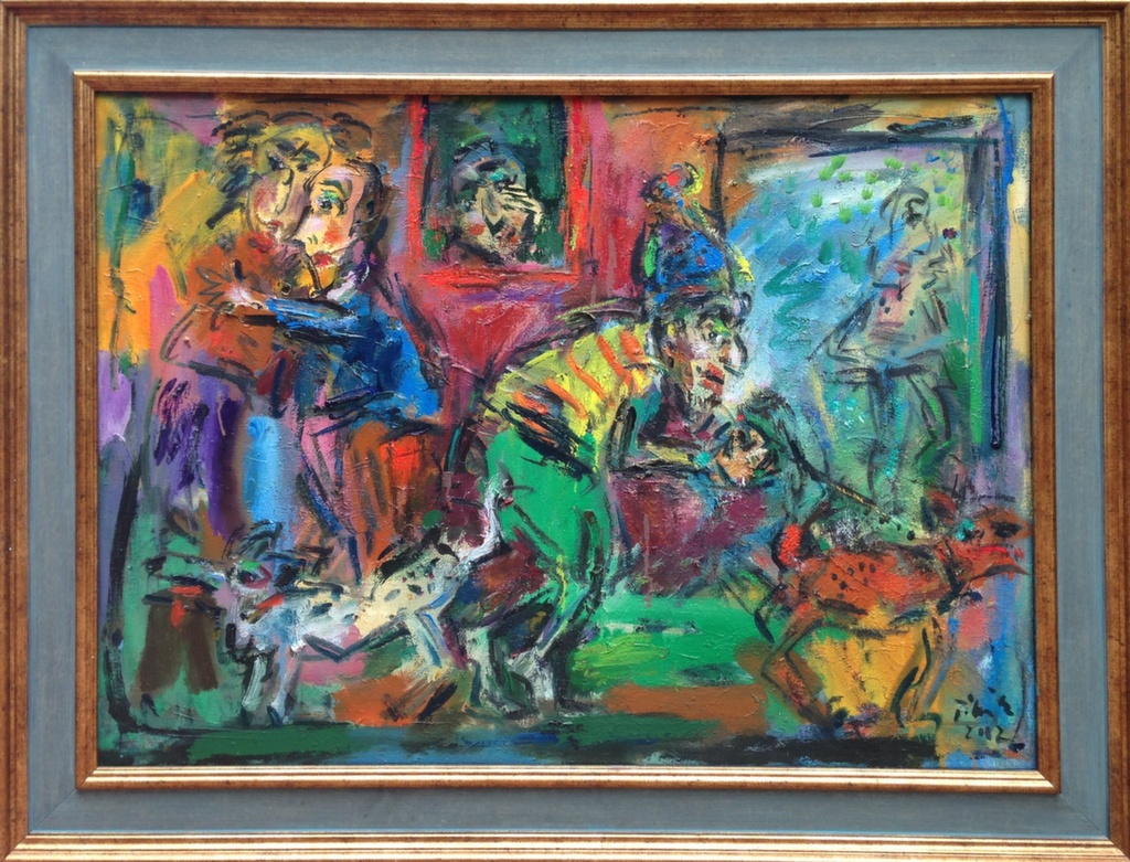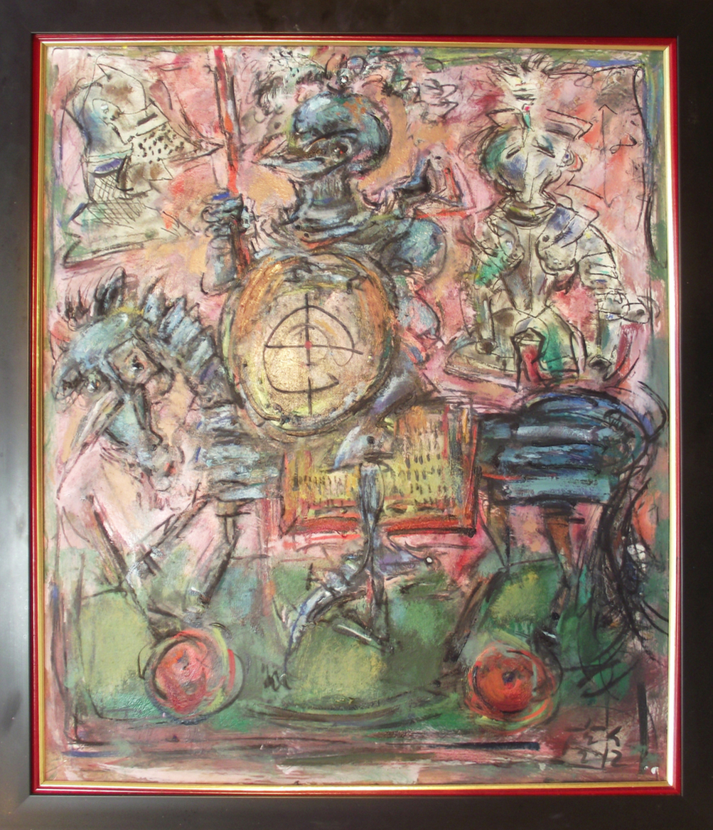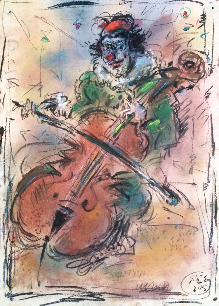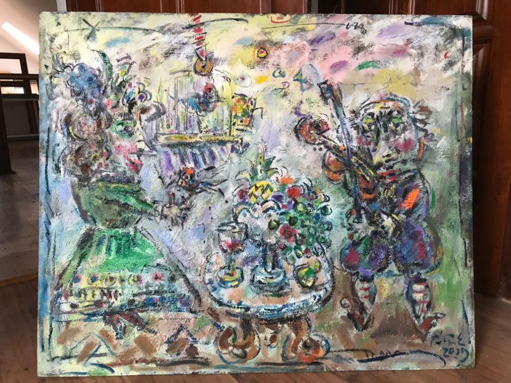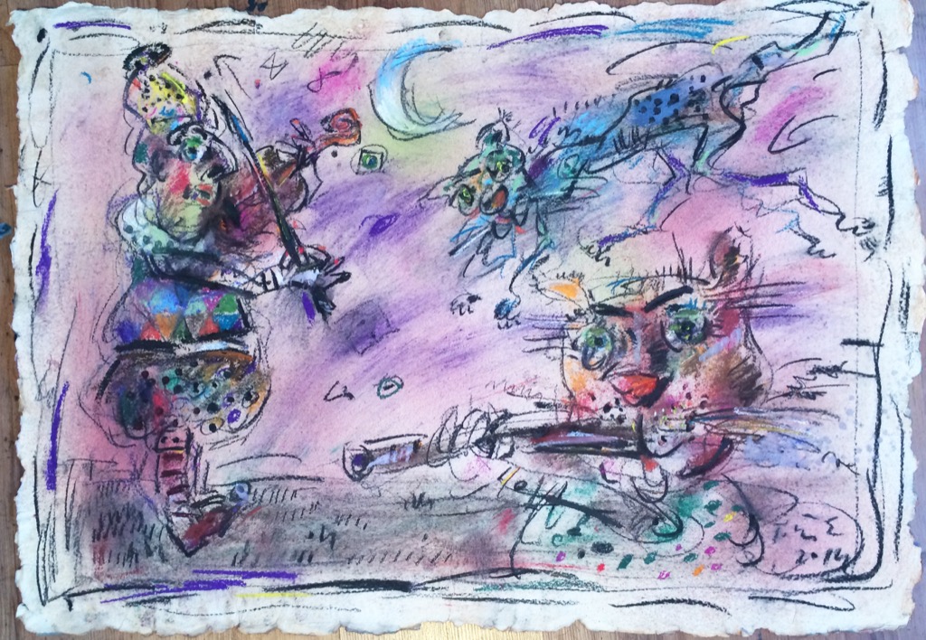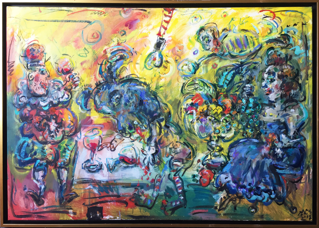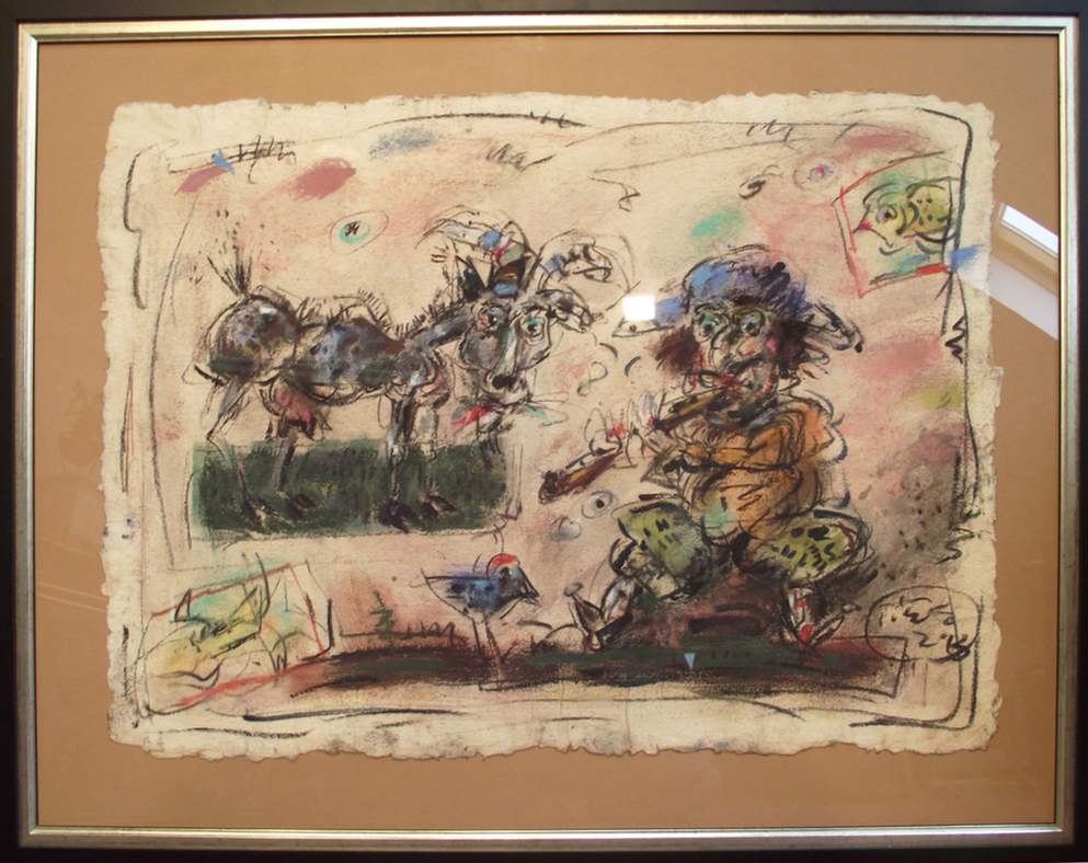 In his painting entitled Would You Like a Glass of Water? Ernő Tóth draws the attention to the dangers of the consumer idiotism exploiting the environment in a rather playful, humorous way. In this picture a clown is taking water for a goldfish put in fish tank. Art is certainly never just the message of the topic, but it is also a game with the artistic means and devices. Although Ernő Tóth emphasises drawing in his works, I would also like to draw the attention to the picturesque reflection on the surface of the water in the fish tank, which recalls the art of Béla Czóbel, Jean Dubuffet and Karel Appel. This clearly shows how Ernő Tóth can keep the joy of playing with colours, even if he has restricted himself into a narrow area within the graphic art. Getting back to that pair of clowns, he also gives an answer to the question why these sweet scamps can be deceived so easily. In his painting depicting clowns playing chess he expresses their stupidity: one of them is narrow-minded and short-sighted, which characters are represented by how closely he is watching the chess piece. The other is a Don Quijote look-like figure, who is thinking with a gesture that recalls Winnie-the-Pooh. Such guys can be cheated very easily! Besides representing both the current and the constant human features, clowns are also very good figures for Ernő Tóth to play with the topic of the great figures in art history, but in a more lyrical, more melancholic and in a somewhat dramatic way. A good example is the Prodigal Son, whose father recalls Rembrandt's figure combined with Picasso's clown king, painted in the painter genius' old days. Of course, the prodigal son is a clown, and since the father is a painter, the home-coming son provides a hidden self-portrait here. Under the pale sun a ladder appears symbolising transcendence and the desire for spiritual purification. The figure spying in the background is again a form of the manipulator and trouble maker customary in Ernő Tóth's paintings.
