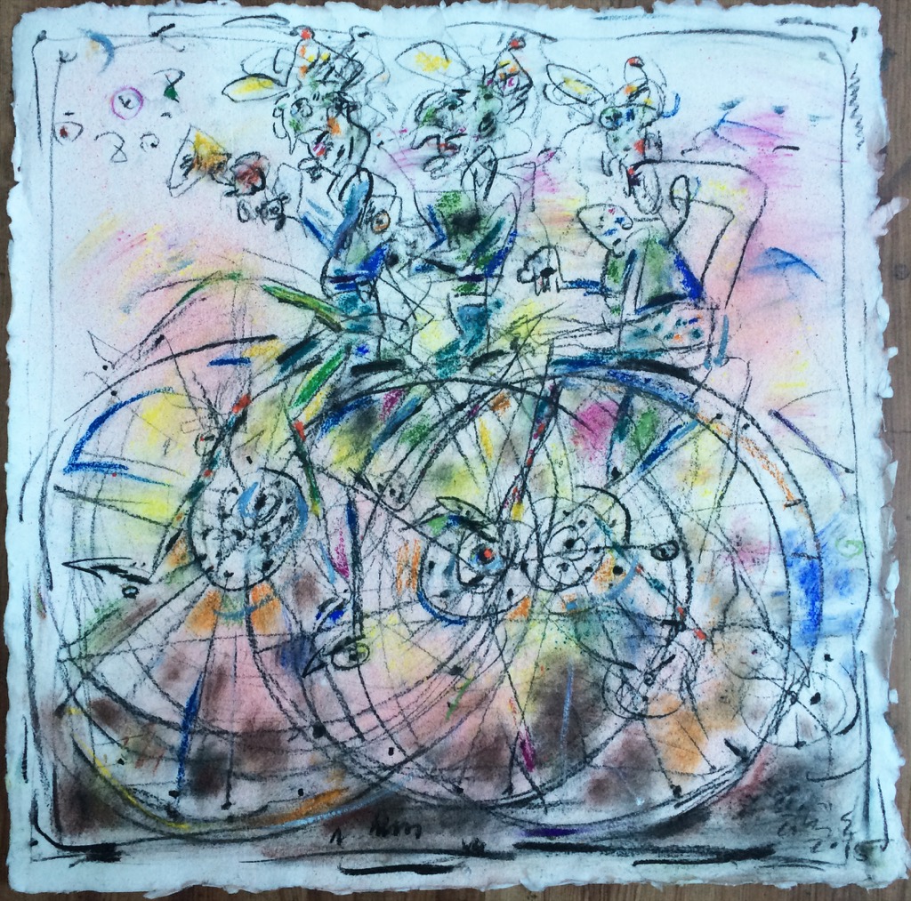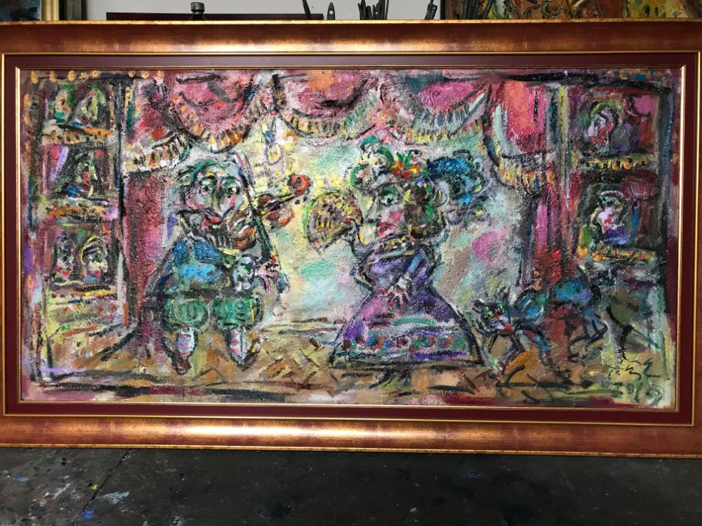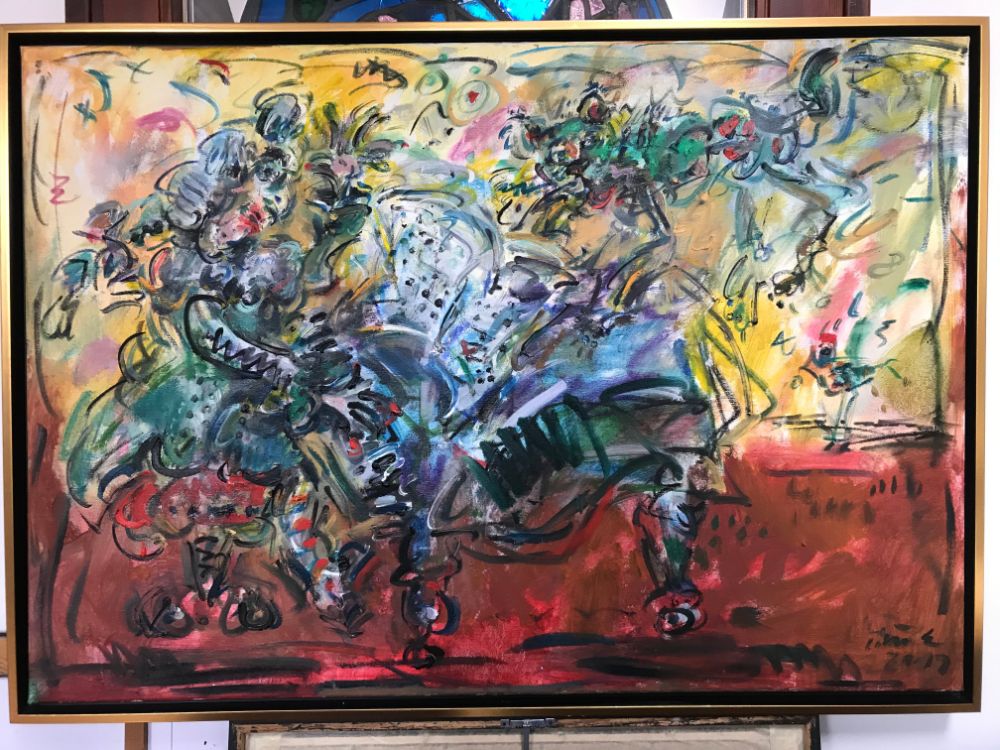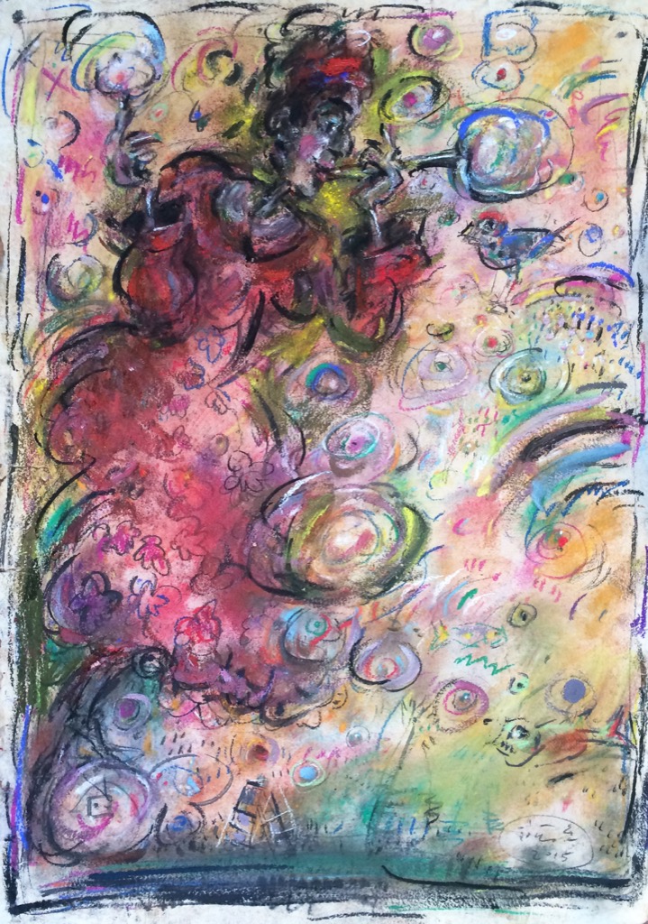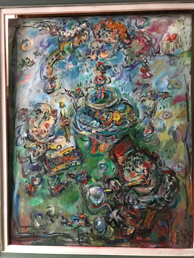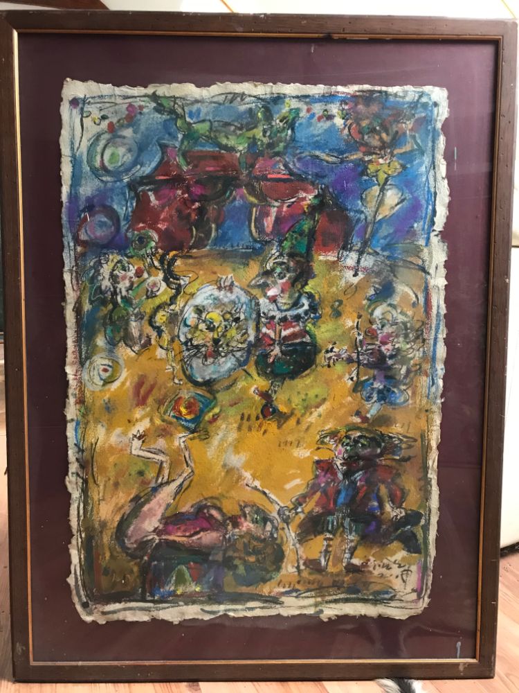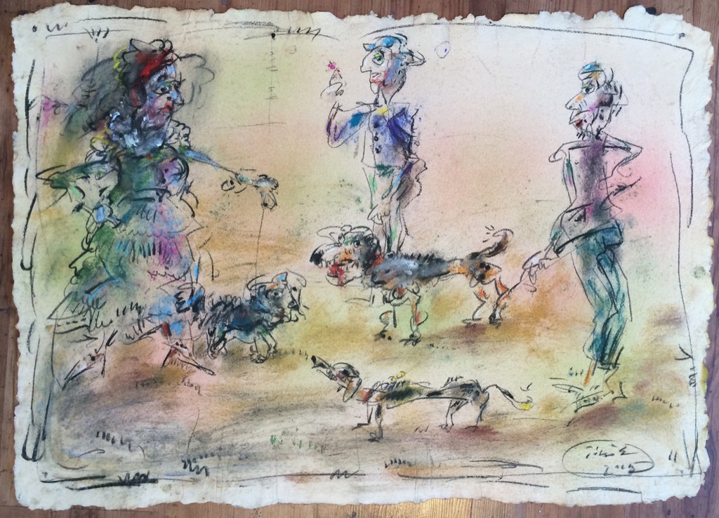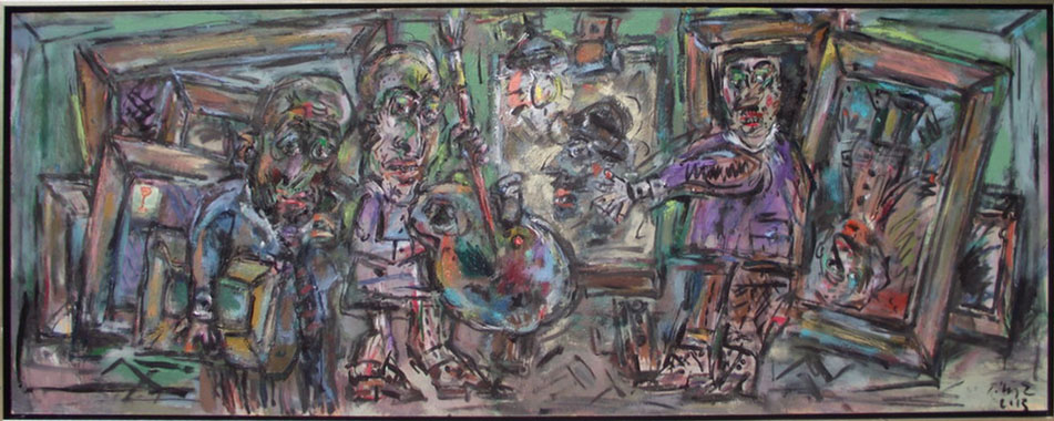 In his painting entitled Would You Like a Glass of Water? Ernő Tóth draws the attention to the dangers of the consumer idiotism exploiting the environment in a rather playful, humorous way. In this picture a clown is taking water for a goldfish put in fish tank. Art is certainly never just the message of the topic, but it is also a game with the artistic means and devices. Although Ernő Tóth emphasises drawing in his works, I would also like to draw the attention to the picturesque reflection on the surface of the water in the fish tank, which recalls the art of Béla Czóbel, Jean Dubuffet and Karel Appel. This clearly shows how Ernő Tóth can keep the joy of playing with colours, even if he has restricted himself into a narrow area within the graphic art. Getting back to that pair of clowns, he also gives an answer to the question why these sweet scamps can be deceived so easily. In his painting depicting clowns playing chess he expresses their stupidity: one of them is narrow-minded and short-sighted, which characters are represented by how closely he is watching the chess piece. The other is a Don Quijote look-like figure, who is thinking with a gesture that recalls Winnie-the-Pooh. Such guys can be cheated very easily! Besides representing both the current and the constant human features, clowns are also very good figures for Ernő Tóth to play with the topic of the great figures in art history, but in a more lyrical, more melancholic and in a somewhat dramatic way. A good example is the Prodigal Son, whose father recalls Rembrandt's figure combined with Picasso's clown king, painted in the painter genius' old days. Of course, the prodigal son is a clown, and since the father is a painter, the home-coming son provides a hidden self-portrait here. Under the pale sun a ladder appears symbolising transcendence and the desire for spiritual purification. The figure spying in the background is again a form of the manipulator and trouble maker customary in Ernő Tóth's paintings.