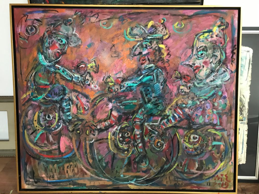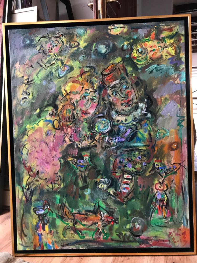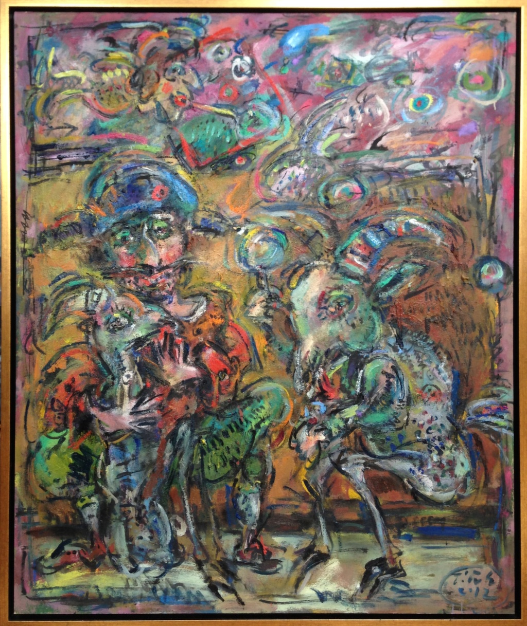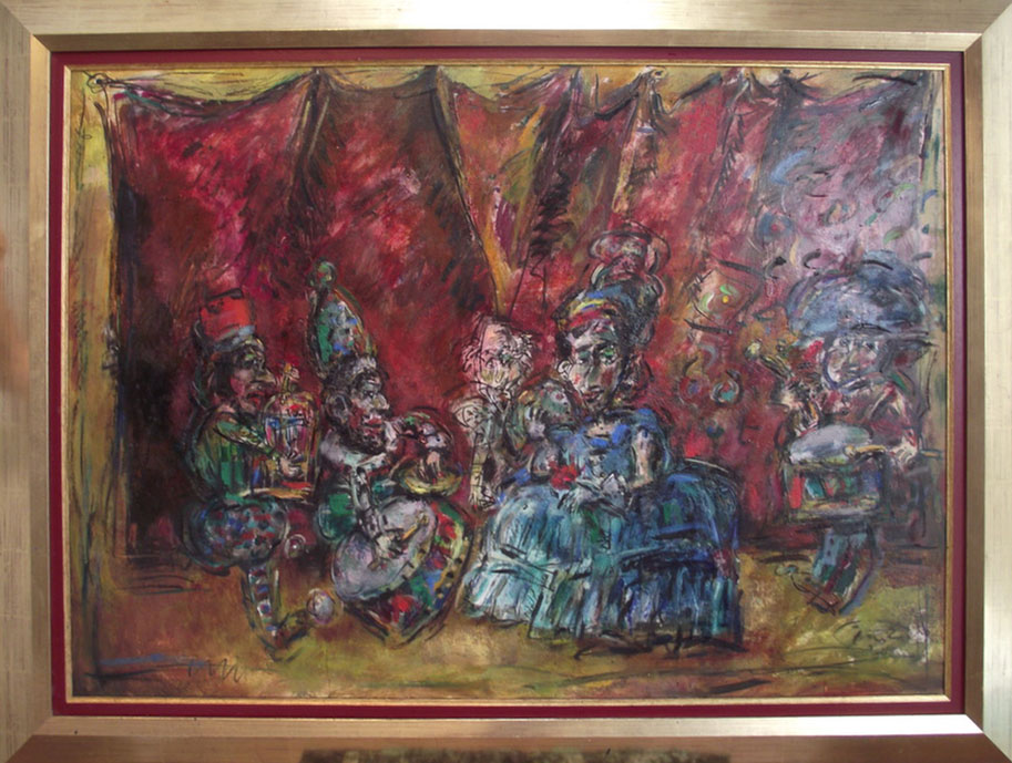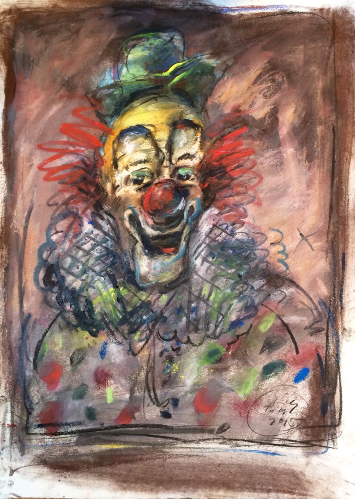 The goat is also a frequent character in Ernő Tóth's paintings. It is the exhibitionist caricature of male arrogance and lust for power. Again, paintings and sculptures show an interesting difference here. While the three-dimensional variation represents the hero as a king showing off his risqué genitals, the drawing depicts a ranting petty bourgeois, who is wearing tracksuit, sitting in his armchair watching TV, as the female members of his family are lionizing him. As well as other animals, the goat has a biographical origin in Ernő Tóth's art. He had a wonderful childhood, when they lived in a suburban part of Miskolc, where they had all kinds of animals in the garden. And Ernő Tóth could have his own little goat. The clown's figure is also rooted in his childhood. As a little boy Ernő Tóth got a bogeyman mask from his mother as a gift. Is it possible, that this good-boy adult was bad as a child? All in all, the identification with the mask and the role led him to his devil figures, who recall naughty kids rather than evil creatures.