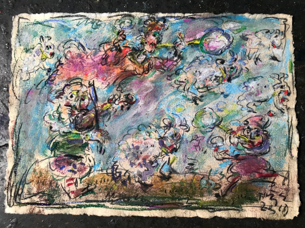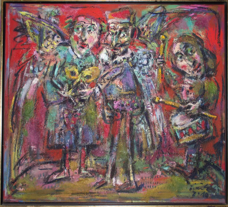 In his art world filled with thousands of small figures, children, putti, fairy tale characters, animals and drawings Ernő Tóth probably tries to extend that happy childhood. In professional terms I could say that he joins the movement of Hungarian art that follows Lajos Gulácsy, György Román, Ilka Gedő, Tamás Lossonczy and goes parallel with Péter Újházi, Péter Földi, Árpád Szabados, Ferenc Banga and others. Their aim is to use children's drawings in order to find the way back to the clean area of the human soul, which people all lose by the time they grow up, and which could be the best means to ease the stressful experiences with the help of humour.
