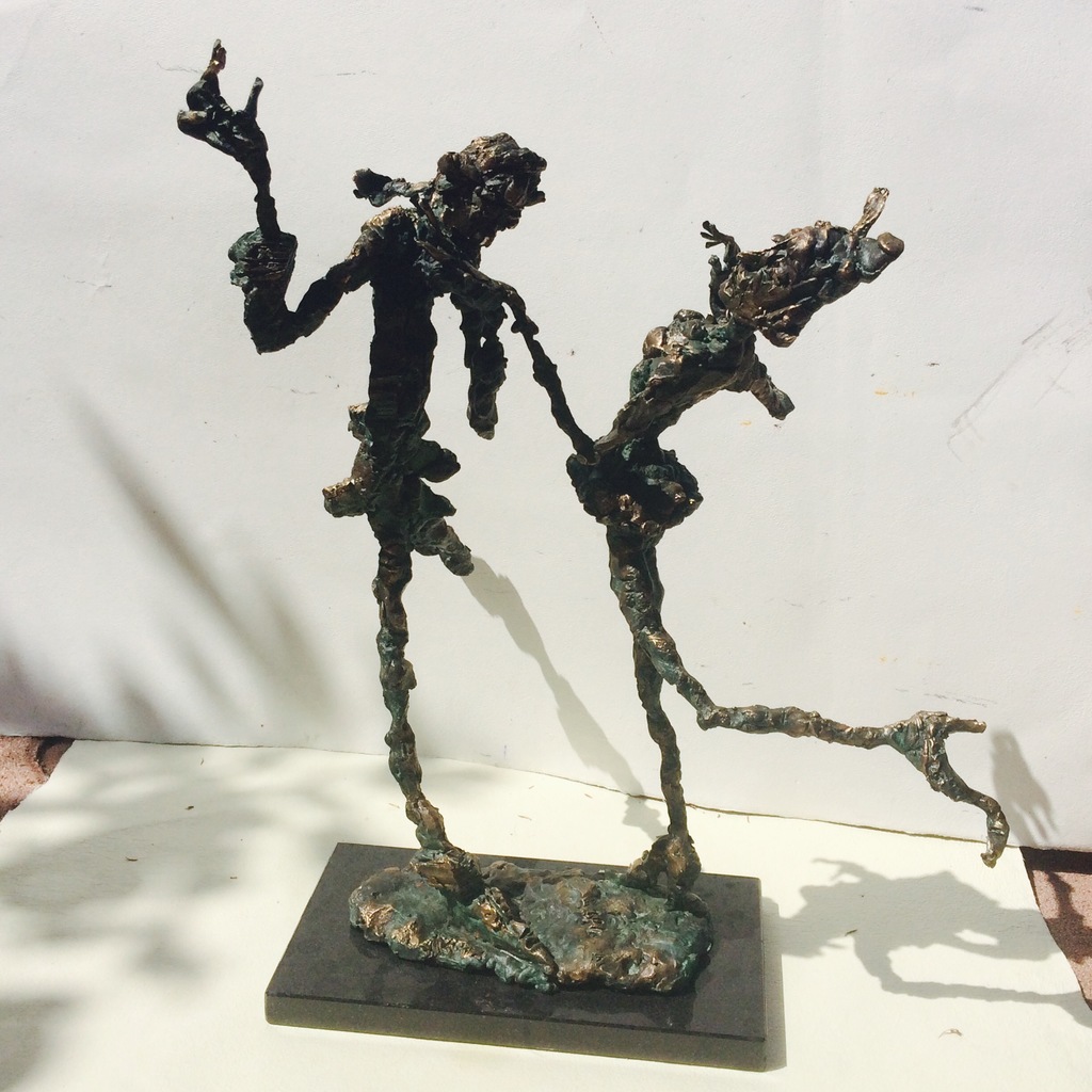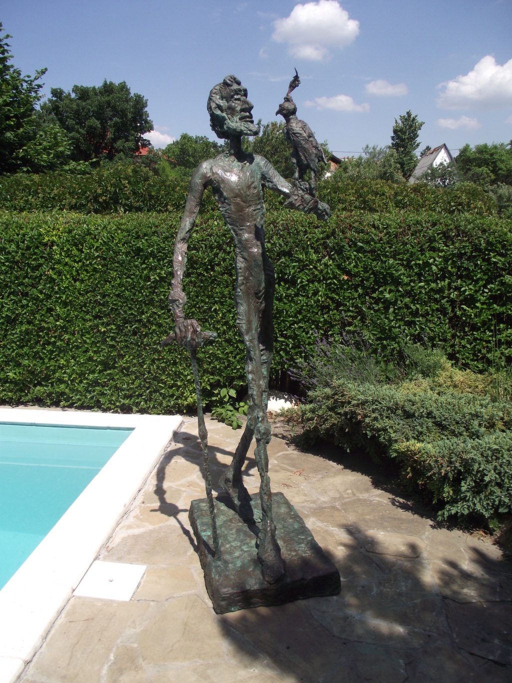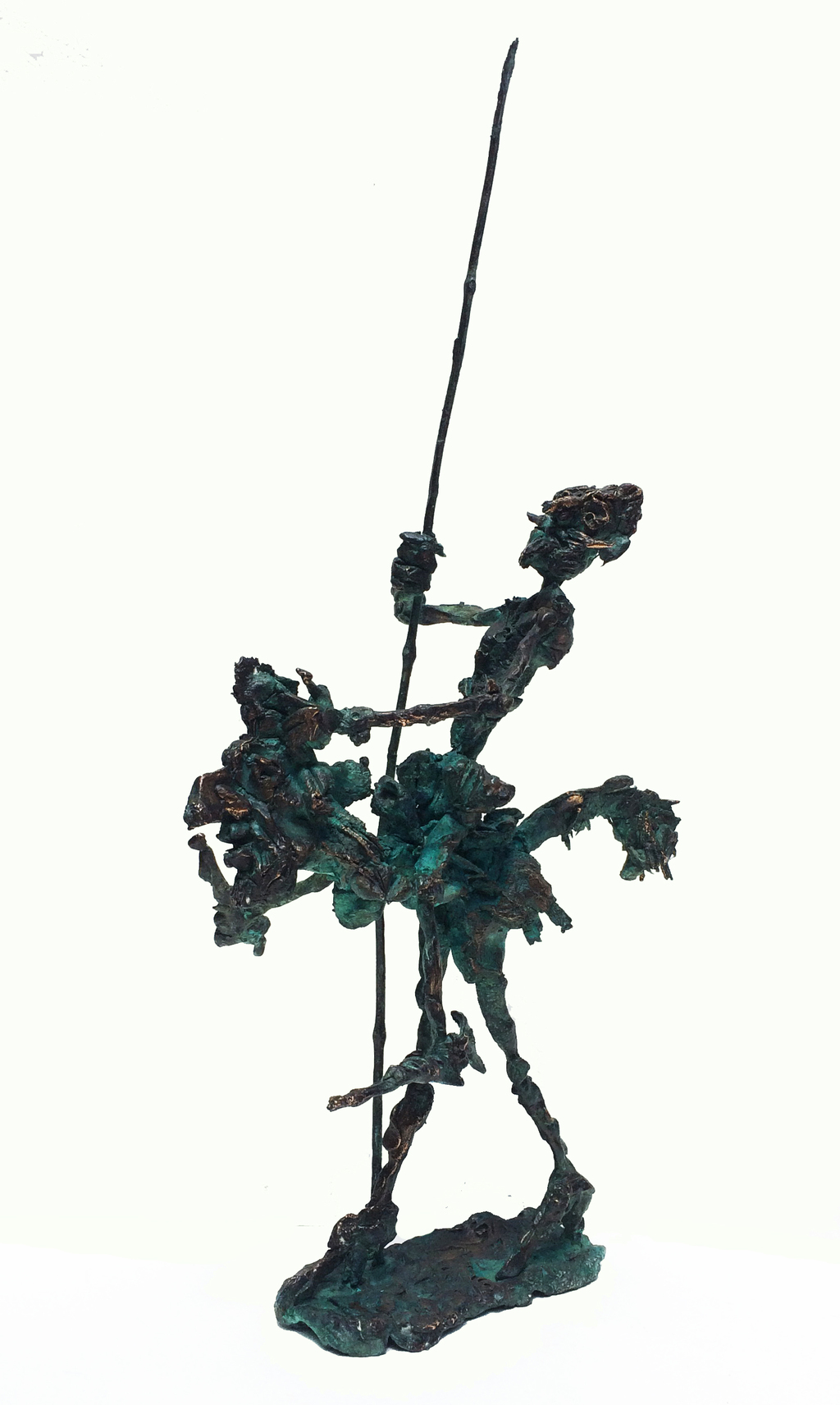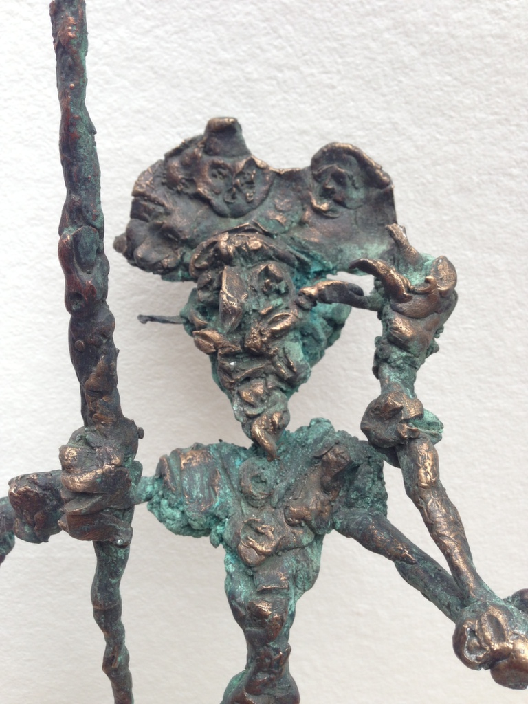 The undressed, lonely heroes of the brightly coloured paintings with whirling motifs return as one- or multi shaped, individual bronze works made with wax flowing technic. The thin stick-like figures create vertical stresses - we rarely see compositions on a horizontal axis such as Don Quijote. The formation of these figures shows us the wish to manifest such caricature-like expressions as: the deformed, elongated body parts, strange dimensions, enlarged and exaggerated features that the sculpture offers. These characteristics finally coalesce into a form that allows our receptive senses to enable us to derive from our objective position what these sculptures offer. The heroes of Ernő Tóth’s sculptures are clowns or clown-like figures. Casanovas - or fellows fancying themselves Casanova. Yet they are doubtlessly helpless against the world and even themselves, figures who are hesitating and clumsy but fanatically struggle on in their petty or large-scale affairs.