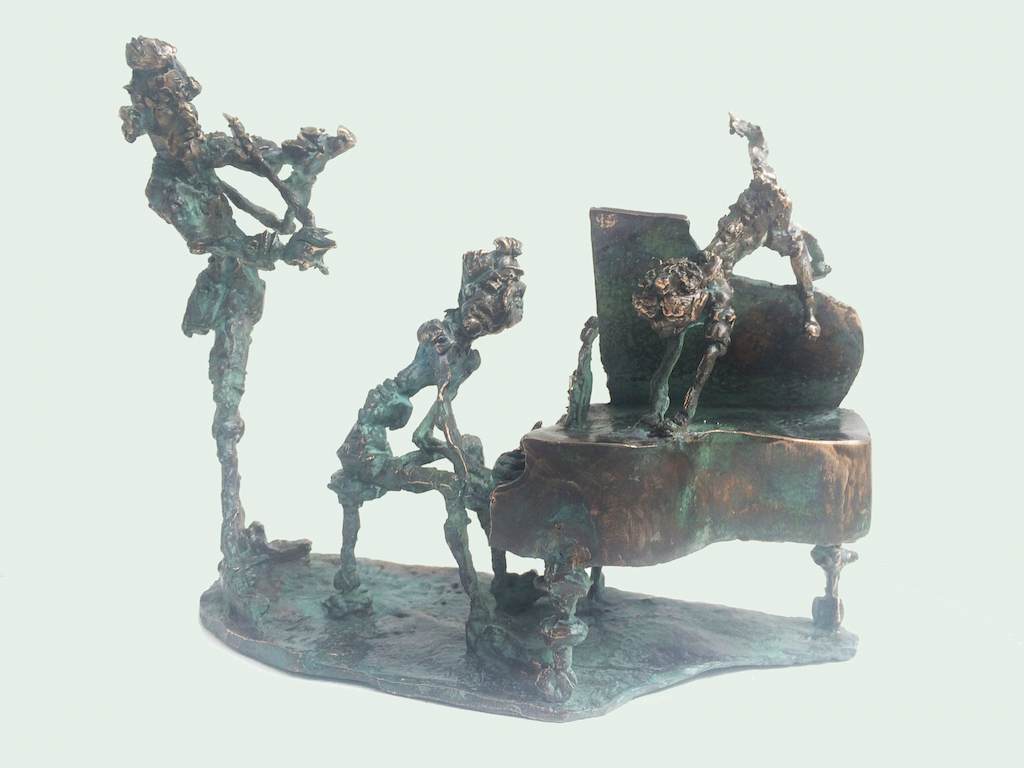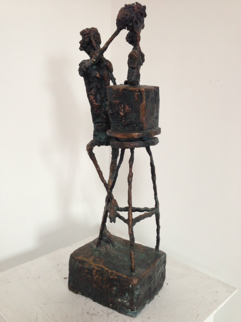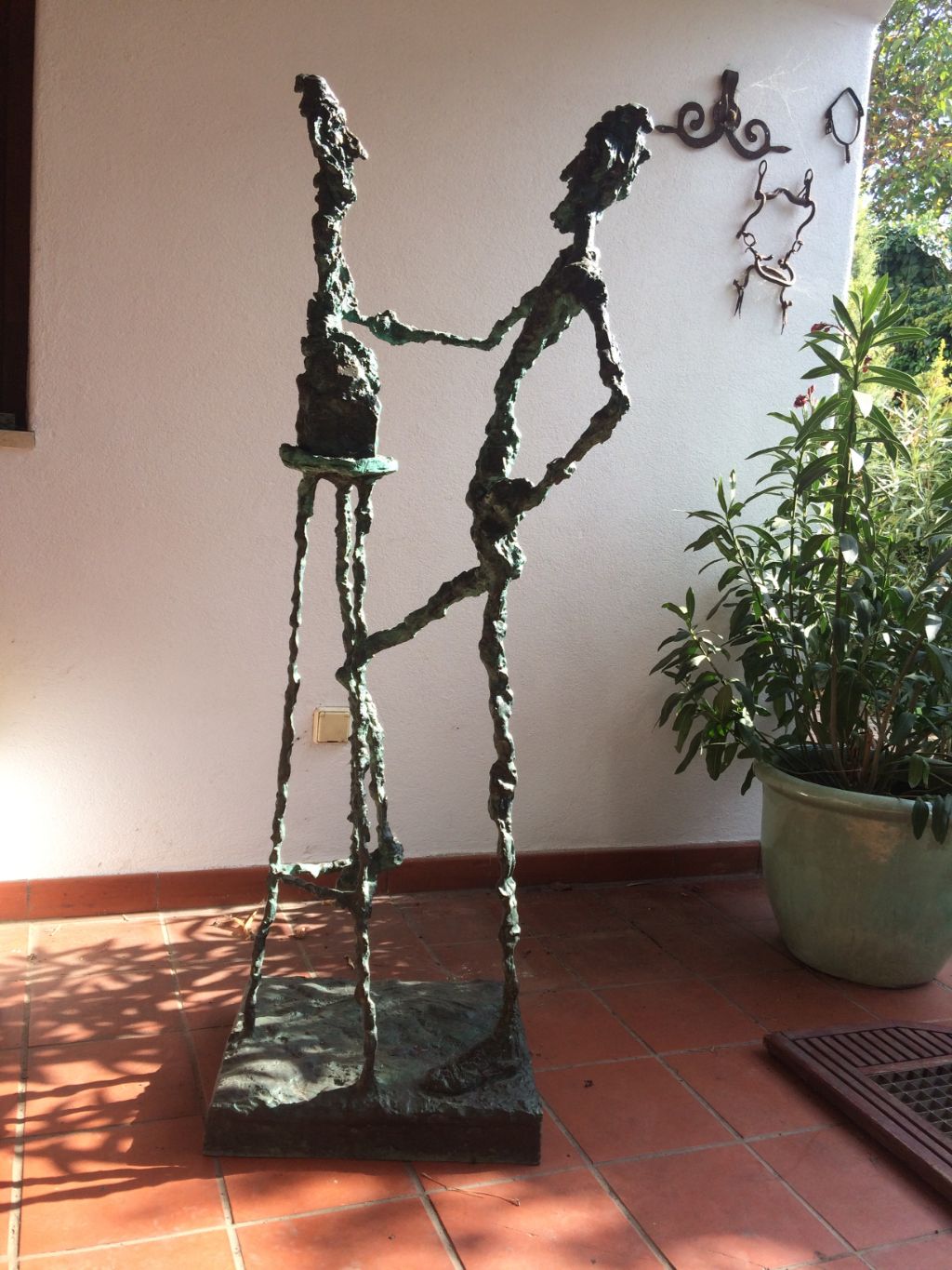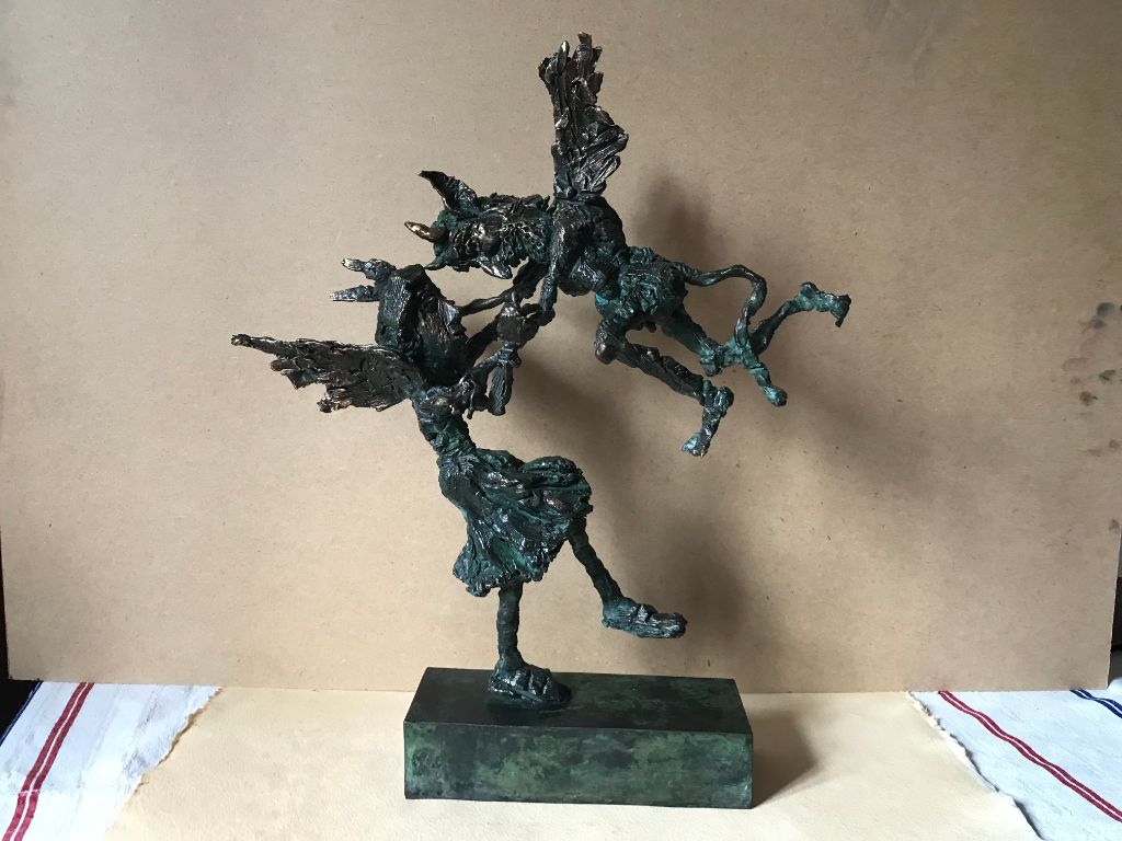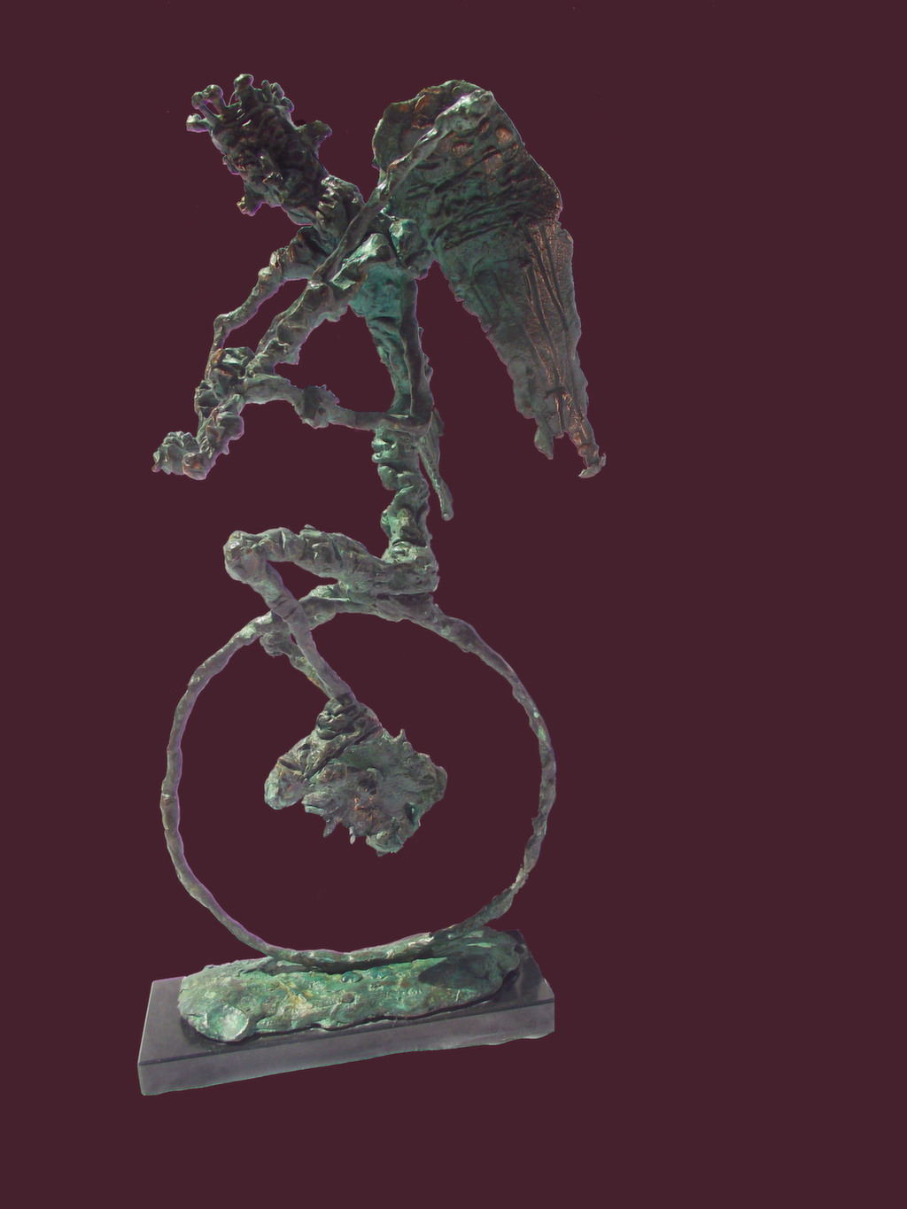 The undressed, lonely heroes of the brightly coloured paintings with whirling motifs return as one- or multi shaped, individual bronze works made with wax flowing technic. The thin stick-like figures create vertical stresses - we rarely see compositions on a horizontal axis such as Don Quijote. The formation of these figures shows us the wish to manifest such caricature-like expressions as: the deformed, elongated body parts, strange dimensions, enlarged and exaggerated features that the sculpture offers. These characteristics finally coalesce into a form that allows our receptive senses to enable us to derive from our objective position what these sculptures offer. The heroes of Ernő Tóth’s sculptures are clowns or clown-like figures. Casanovas - or fellows fancying themselves Casanova. Yet they are doubtlessly helpless against the world and even themselves, figures who are hesitating and clumsy but fanatically struggle on in their petty or large-scale affairs.