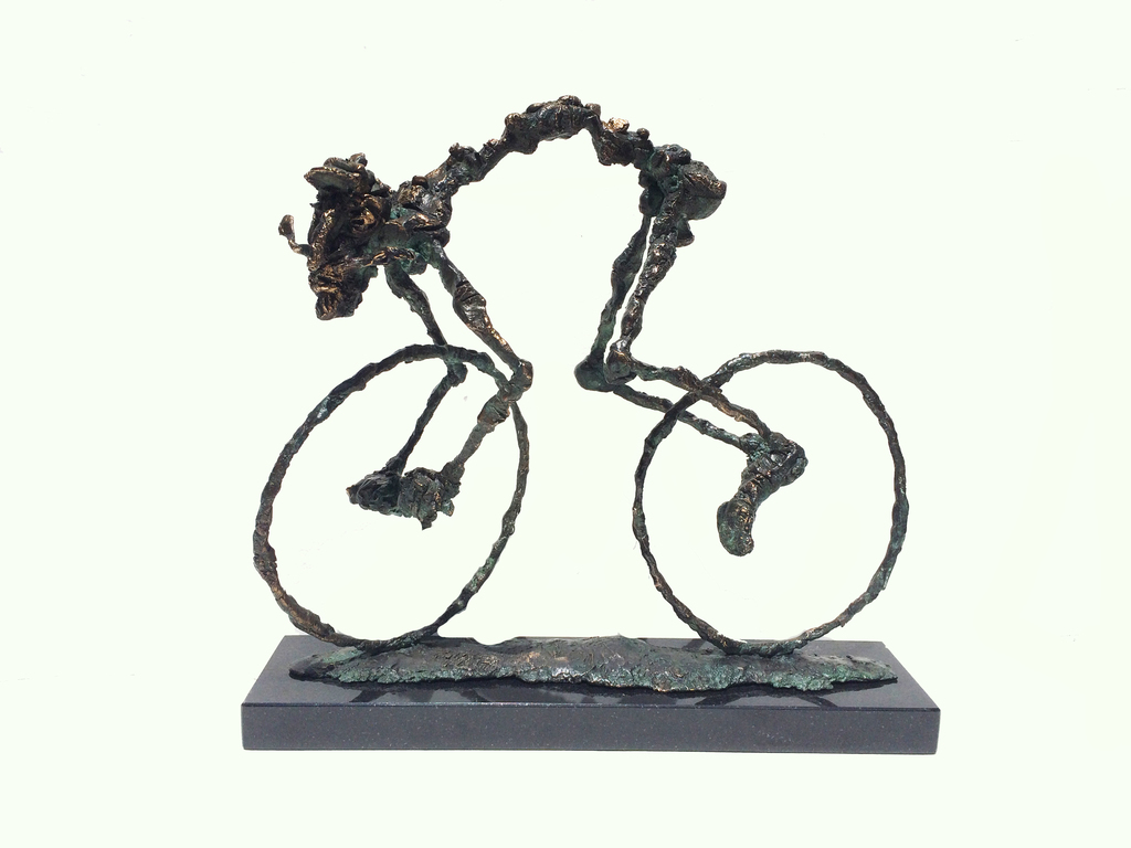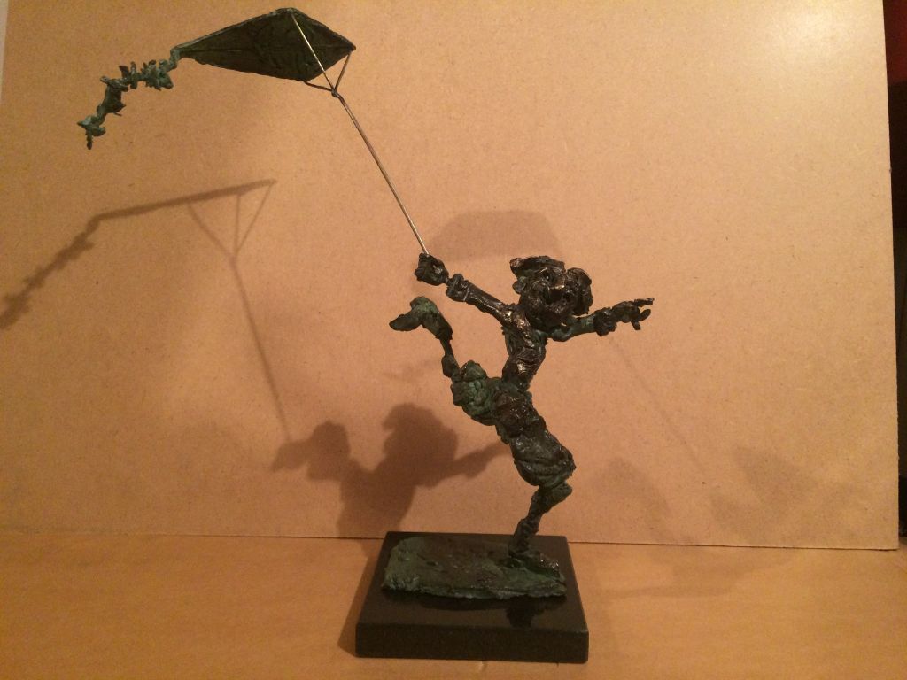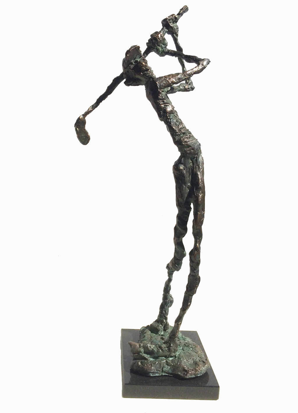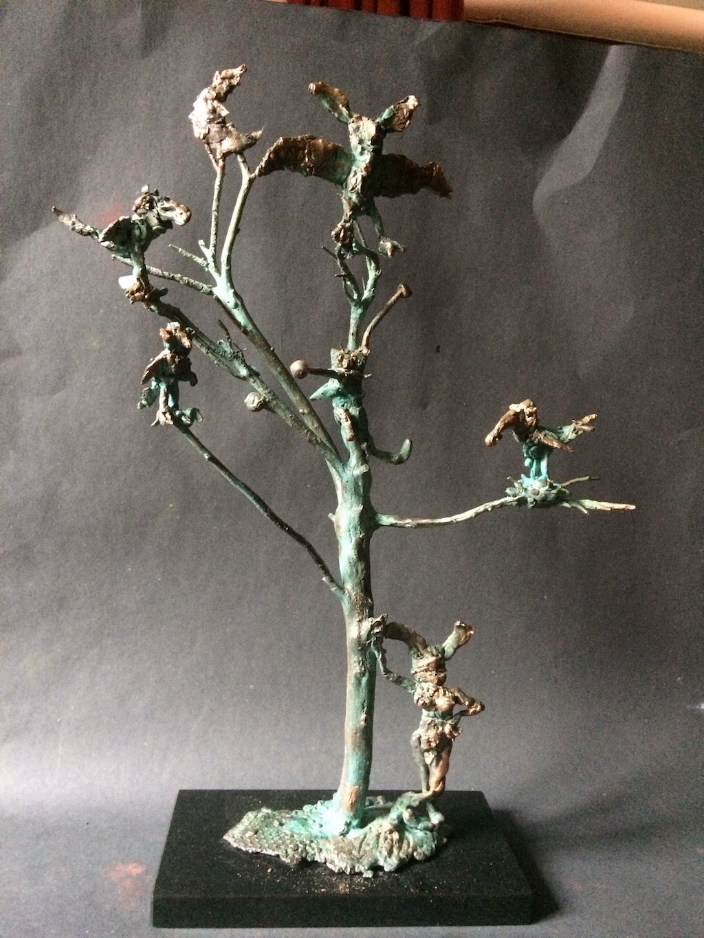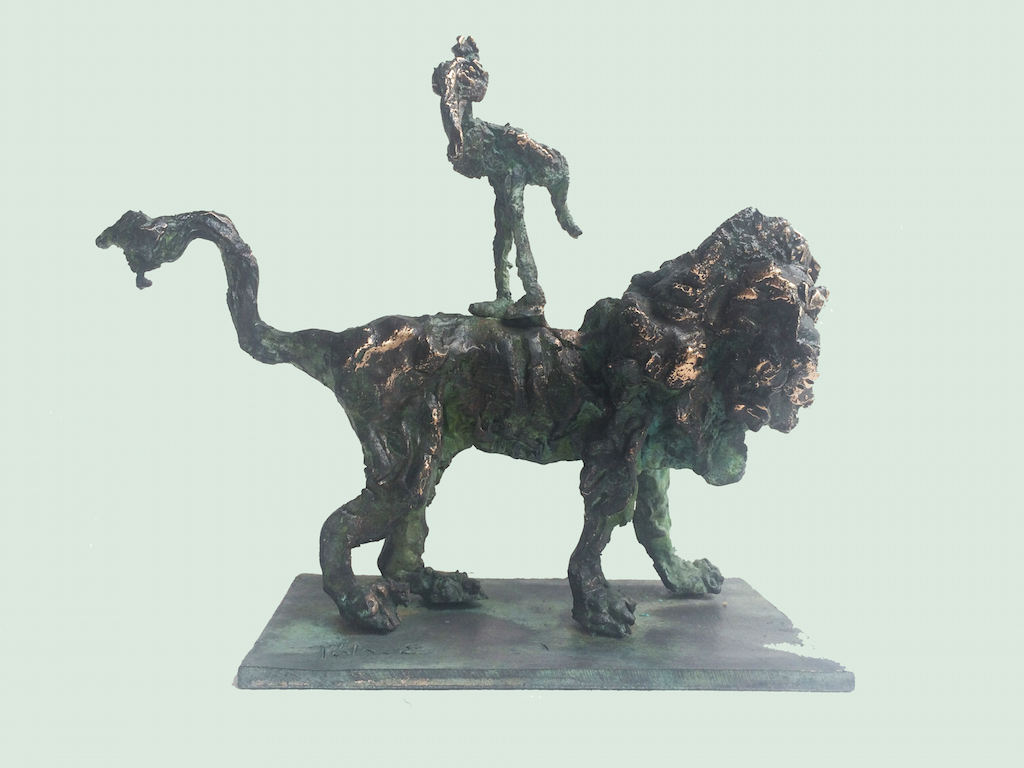 The undressed, lonely heroes of the brightly coloured paintings with whirling motifs return as one- or multi shaped, individual bronze works made with wax flowing technic. The thin stick-like figures create vertical stresses - we rarely see compositions on a horizontal axis such as Don Quijote. The formation of these figures shows us the wish to manifest such caricature-like expressions as: the deformed, elongated body parts, strange dimensions, enlarged and exaggerated features that the sculpture offers. These characteristics finally coalesce into a form that allows our receptive senses to enable us to derive from our objective position what these sculptures offer. The heroes of Ernő Tóth’s sculptures are clowns or clown-like figures. Casanovas - or fellows fancying themselves Casanova. Yet they are doubtlessly helpless against the world and even themselves, figures who are hesitating and clumsy but fanatically struggle on in their petty or large-scale affairs.